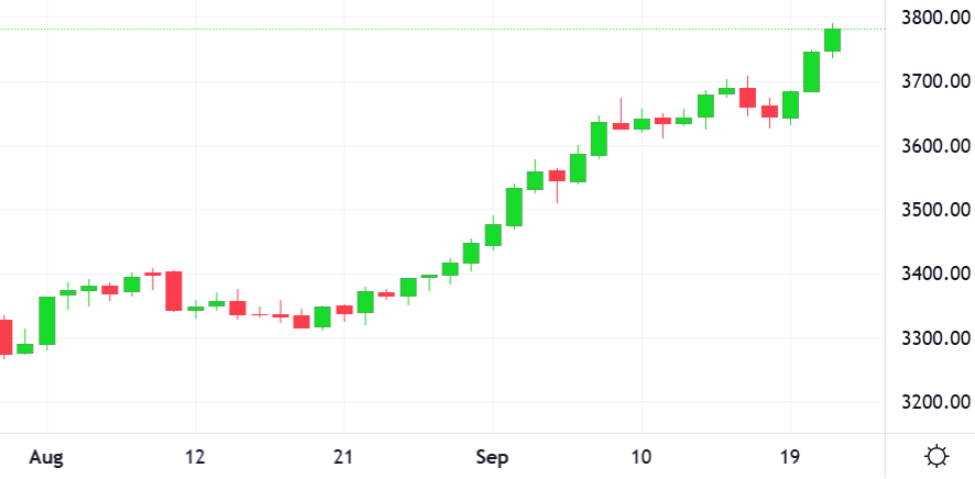 Gold rose nearly 2% to an all-time high, fueled by growing expectations of further U.S. rate cuts and persistent safe-haven demand amid political uncertainty. Investors are closely watching upcoming Federal Reserve speeches and key inflation data for fresh policy signals.