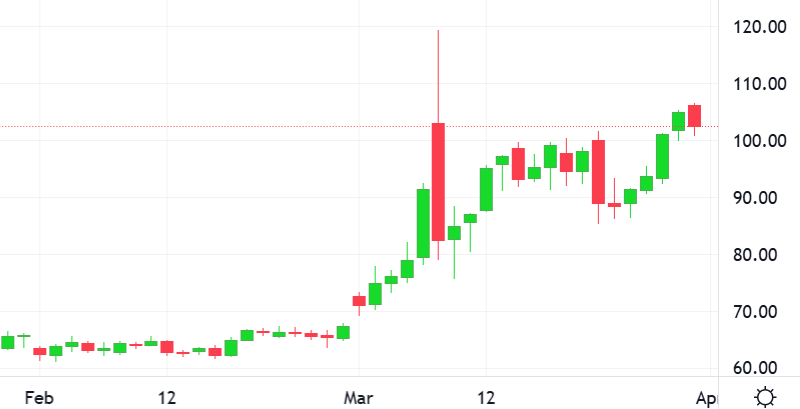 Benchmark oil prices extended gains toward their largest ever monthly increase, as major Wall Street indexes were mixed in choppy trade and investors focused on the war on Iran that they fear will drive inflation and raise the risk of recession across the ‌globe.