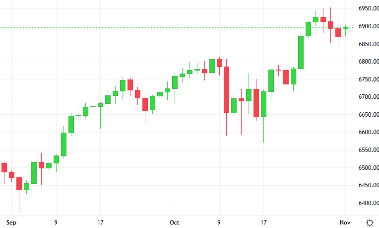 | A resilient U.S. stocks rally heads into a busy week of corporate results, with investors concerned about the strength of the artificial intelligence trade and about how aggressively the Federal Reserve will cut interest rates. The S&P 500 on Friday ended October up 2.3% for the month, its sixth straight month of gains. |